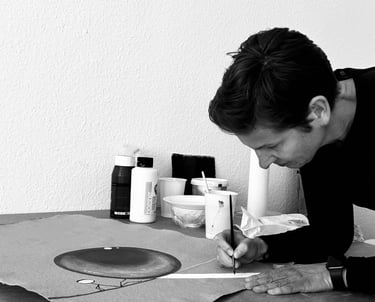 Obwohl ich eine gute Leinwand zu schätzen weiss, habe ich mich in die besondere Haptik und Struktur von handgeschöpftem Papier verliebt. Ich verwende Papiere in verschiedenen Formaten mit einer Grammatur von mind. 440 g pro Quadratmeter.